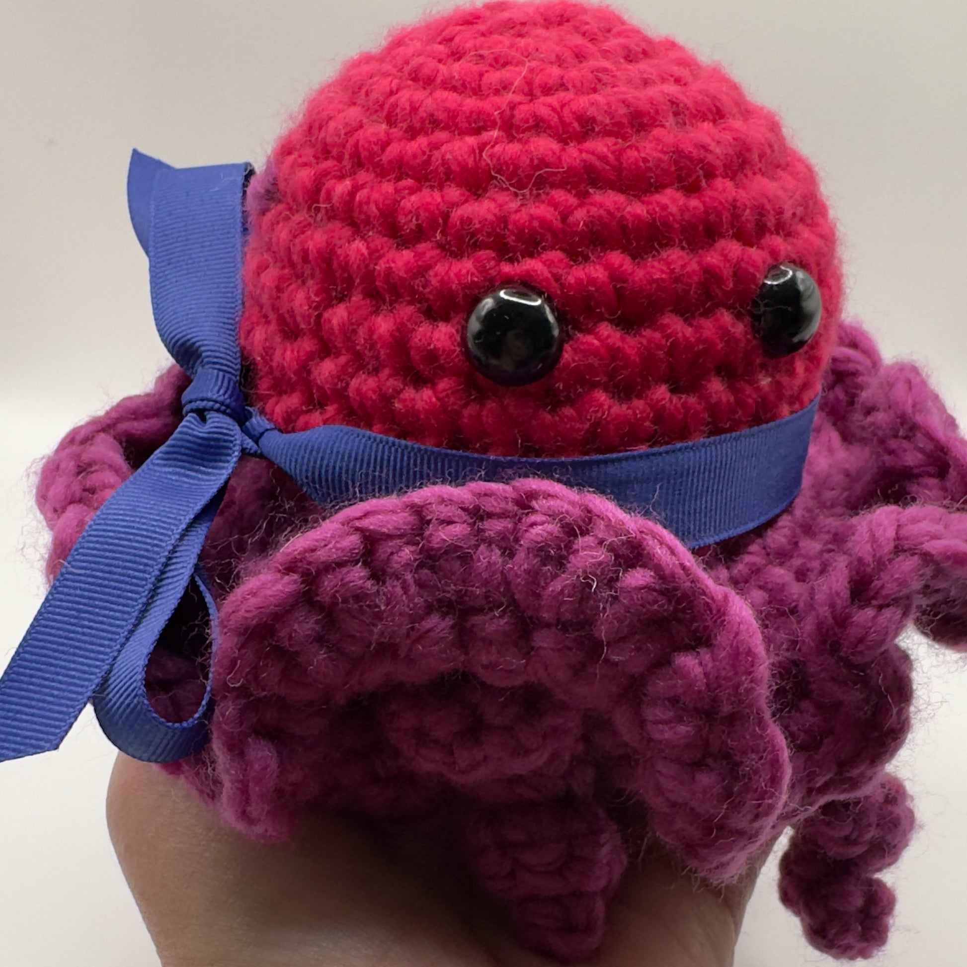 Deep pink and bright purple octopus. Made with chunky wool yarn, soft feel. Blue ribbon is removable. Hypoallergenic polyester fill. Plastic safety eyes. Comes in cotton drawstring bag.