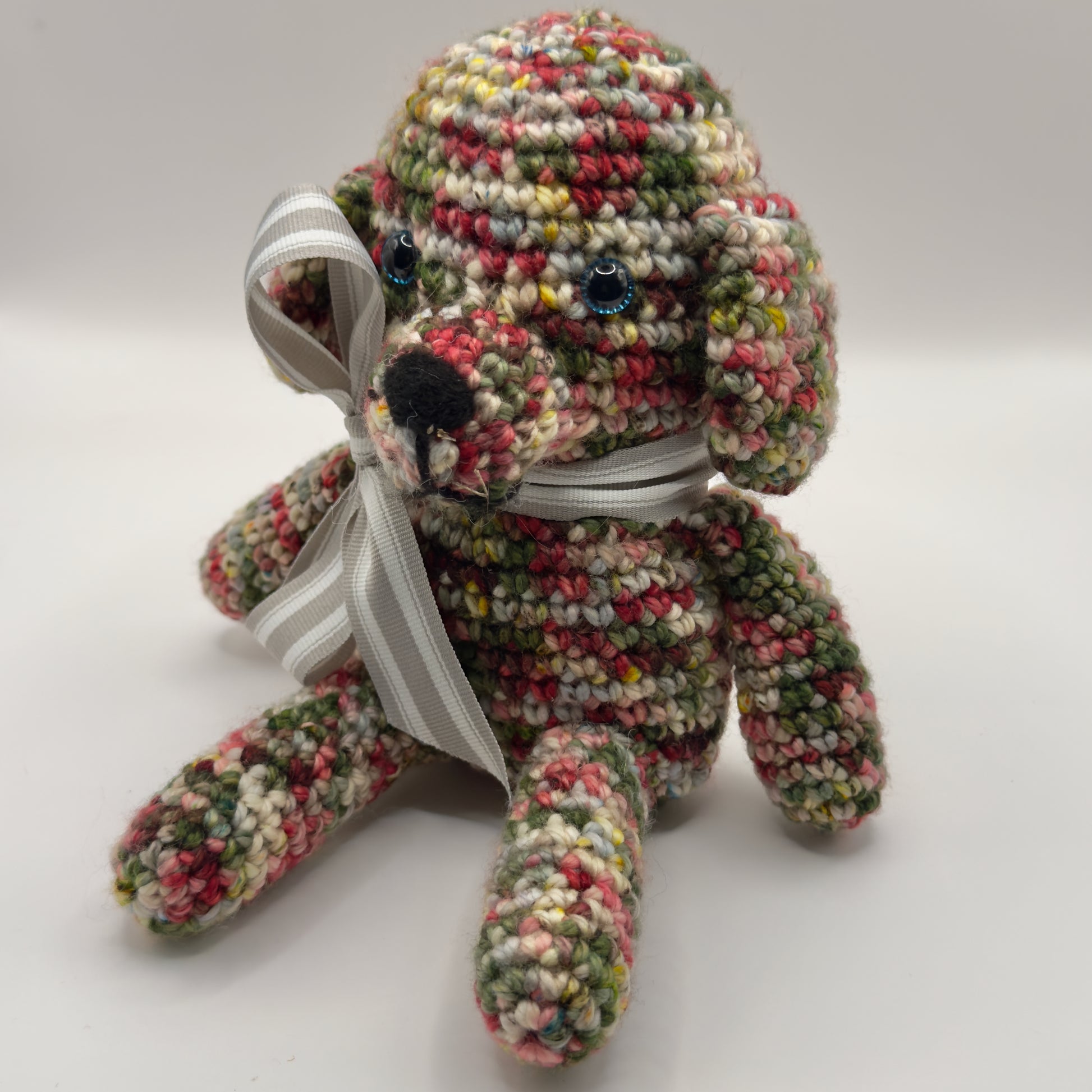 Multicolors of red, green, yellow and more. Sitting doggie comes with cotton drawstring bag. Hand dyed premium yarn. Grey striped bow. Hypoallergenic polyester fill. Plastic safety eyes. Hand wash or spot clean.
