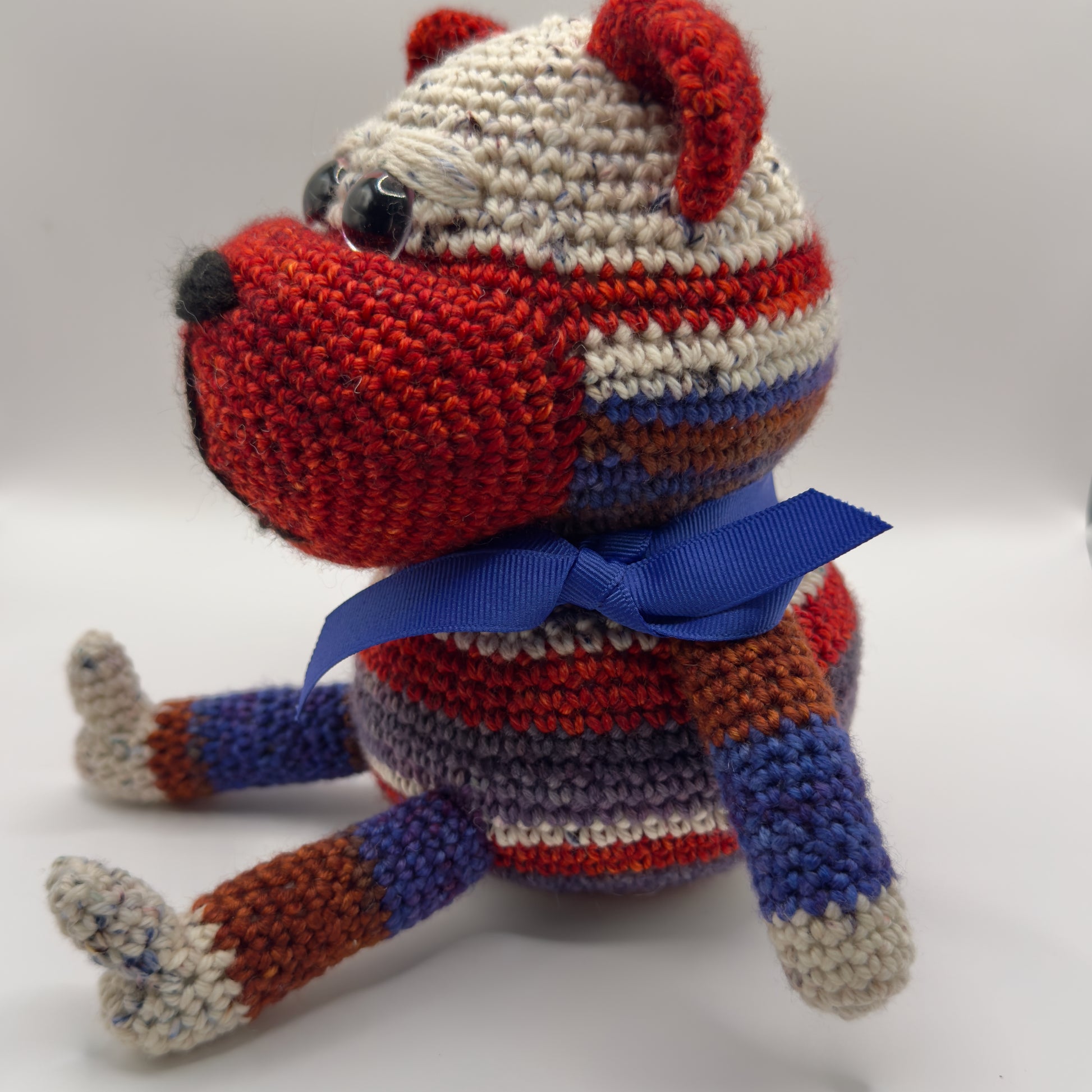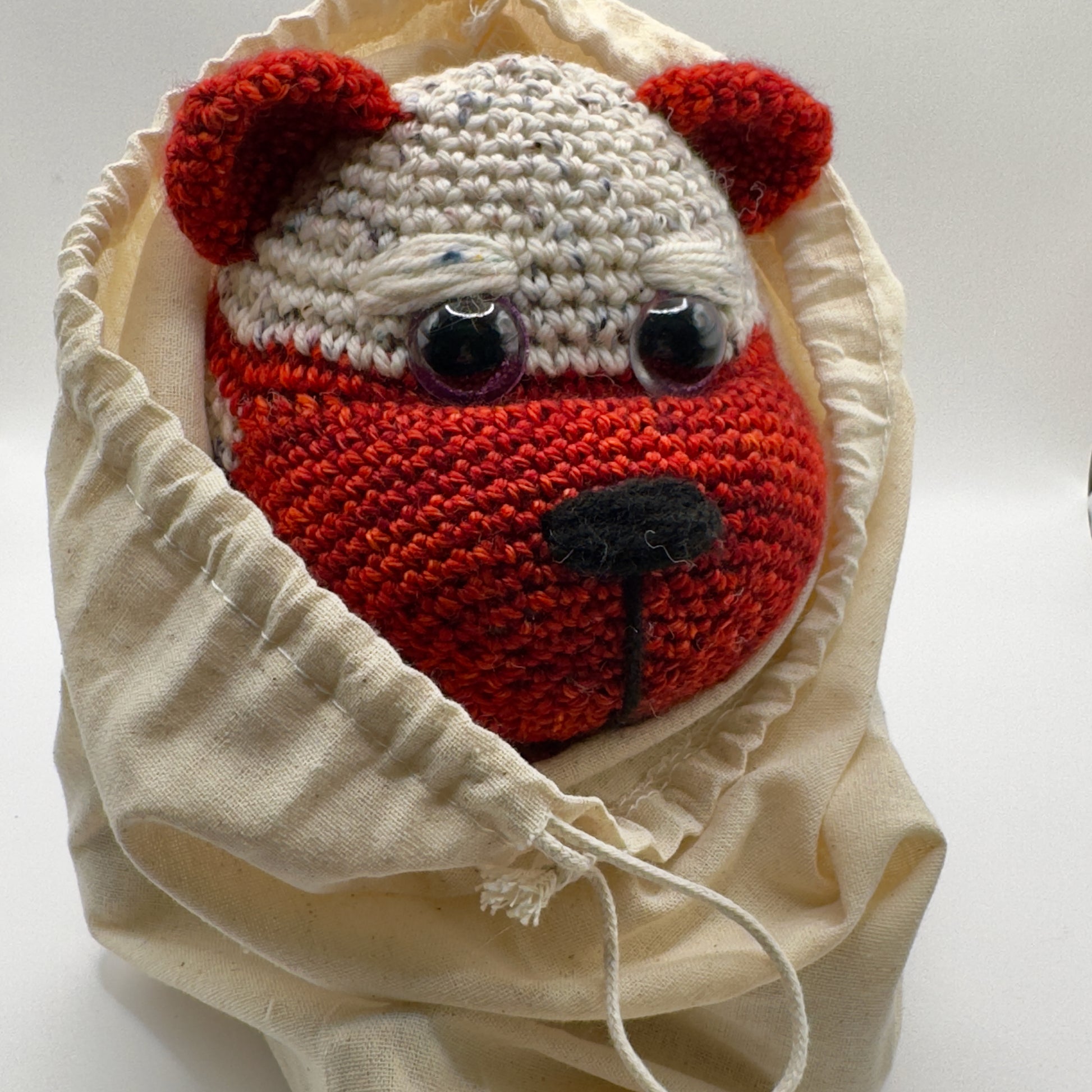 Made with a single skein of merino wool yarn in colors of red, white and blue. Bear has big safety eyes and a blue ribbon. Comes with cotton drawstring bag. No interior wires or frames. Hypoallergenic polyester fill. Hand wash or spot clean.